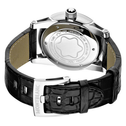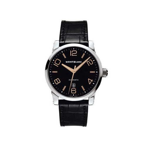 42 mm stainless steel watch with black dial, red-gold plated hands and numerals, automatic movement, date display, black alligator-skin strap